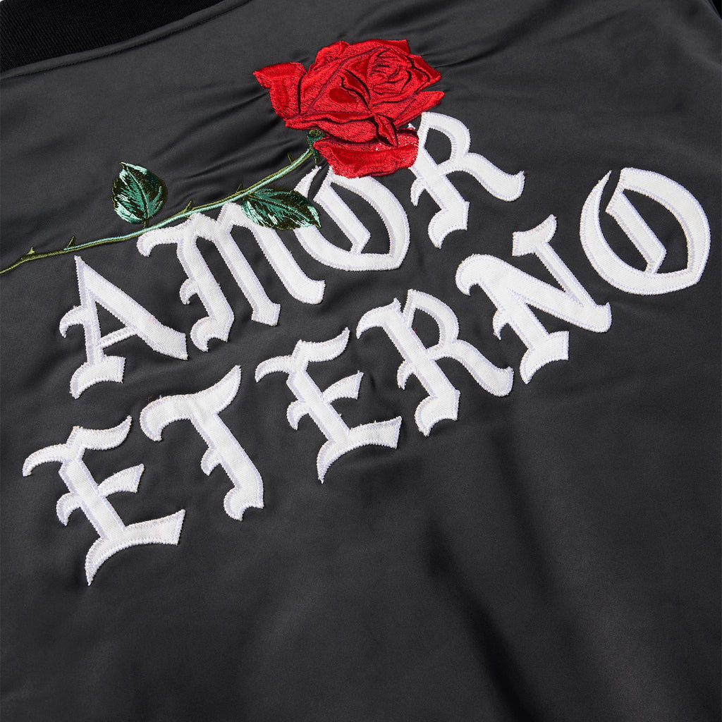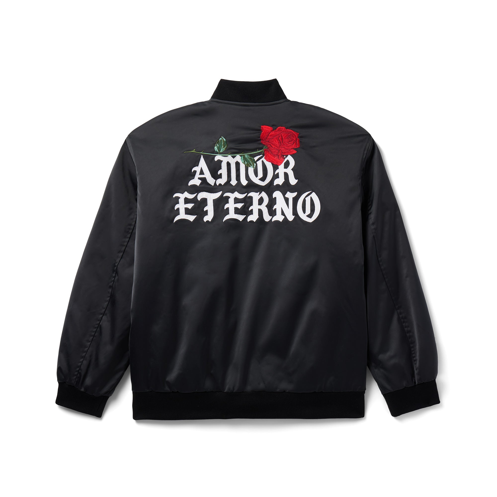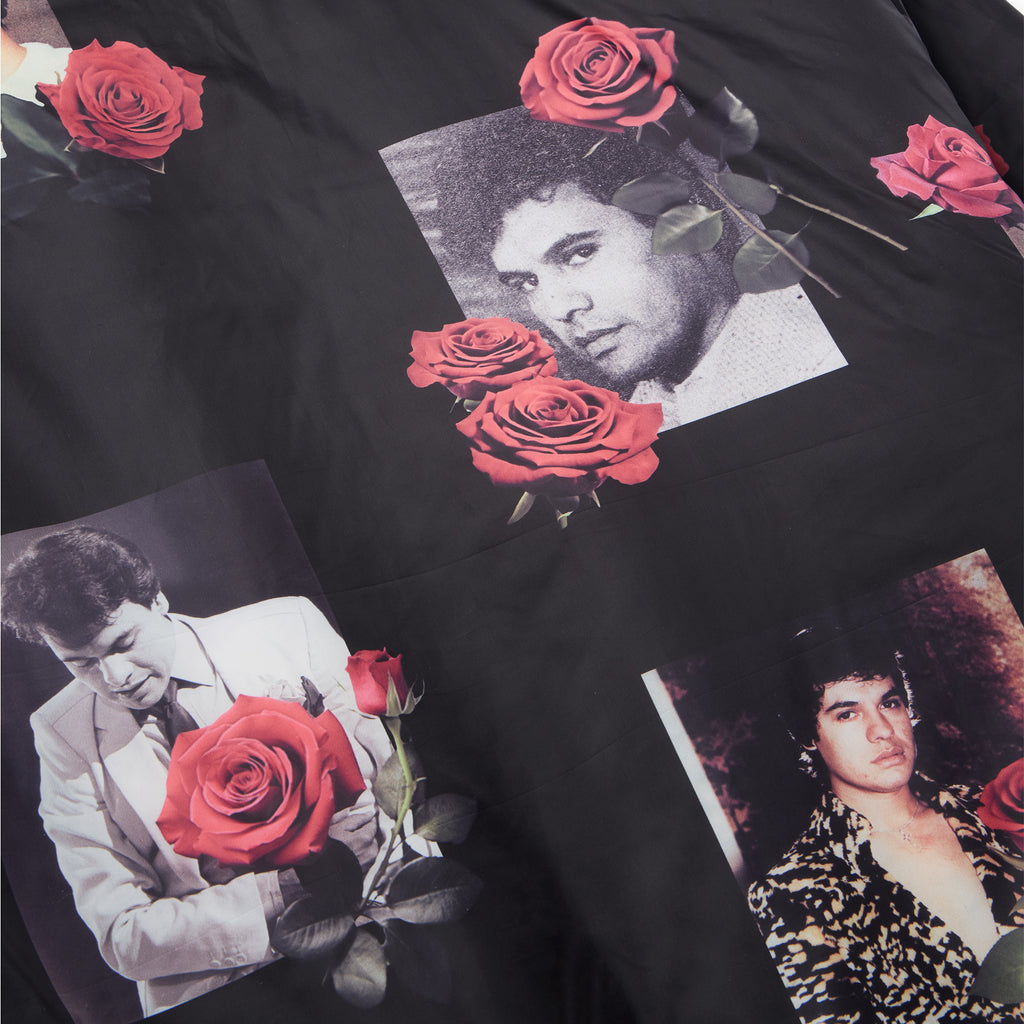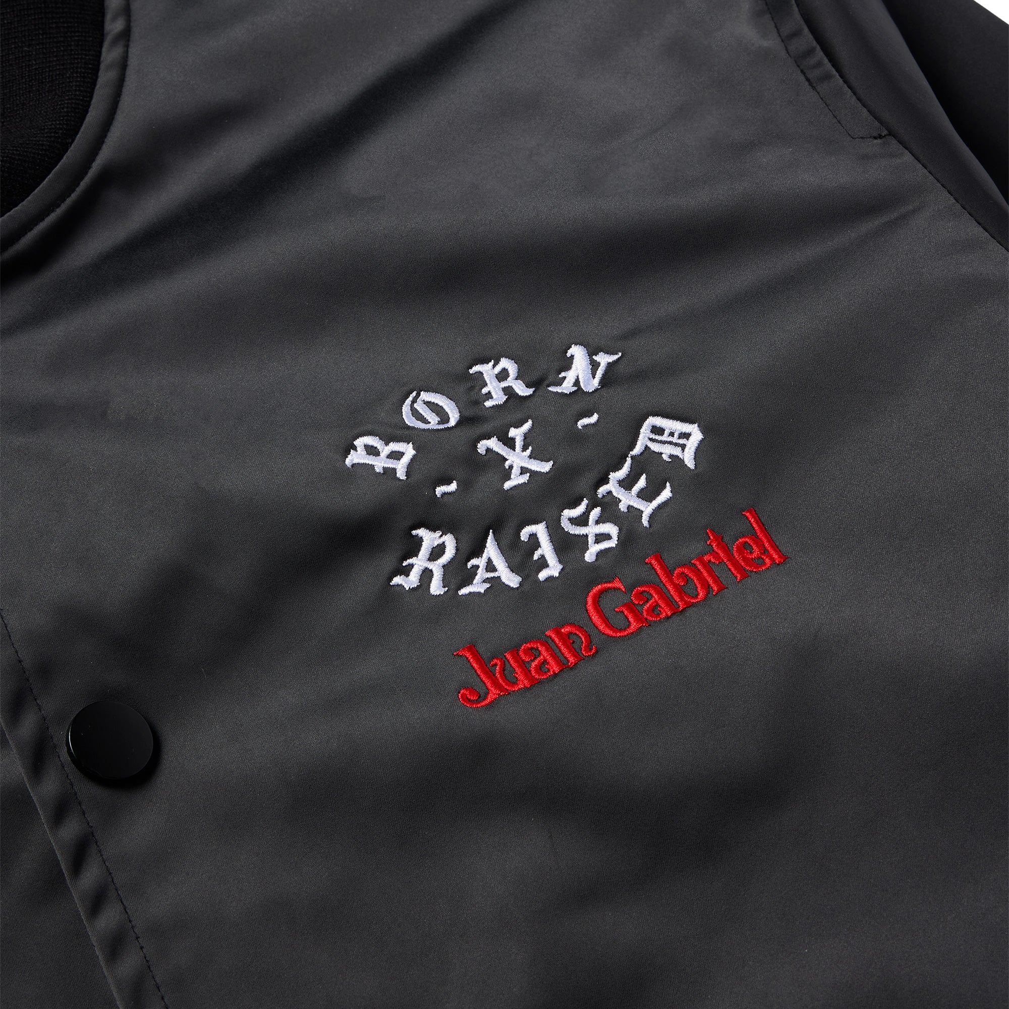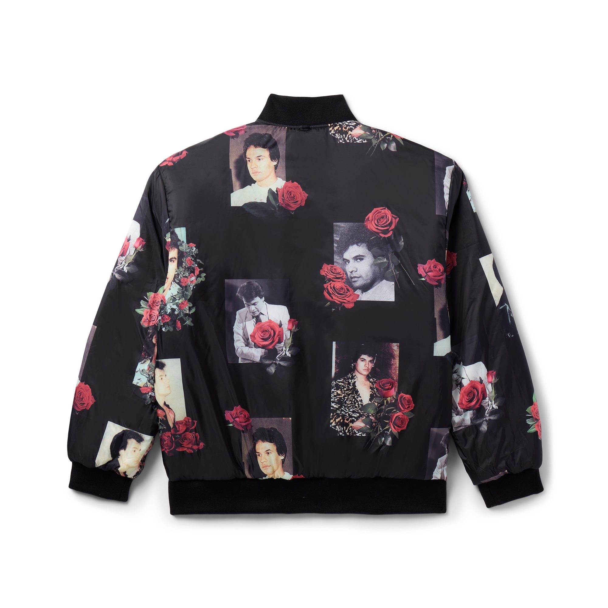 OFFICIAL COLLABORATION WITH THE ESTATE OF JUAN GABRIEL. 100% POLYESTER REVERSIBLE STADIUM JACKET. EMBROIDERED ARTWORK ON OUTER LEFT CHEST AND OUTER BACK. JUAN GABRIEL PORTRAIT PATTERN LINING ON INTERIOR.