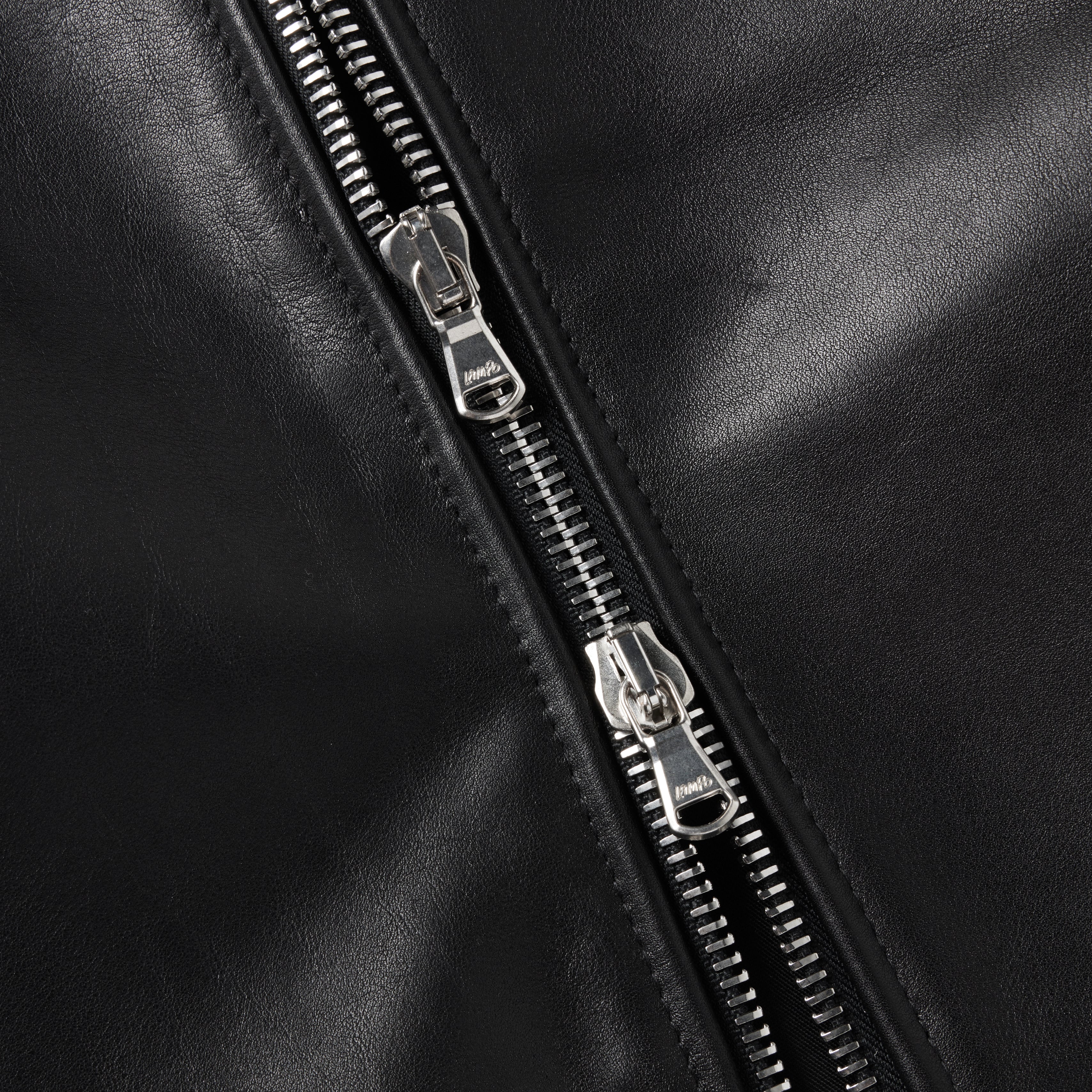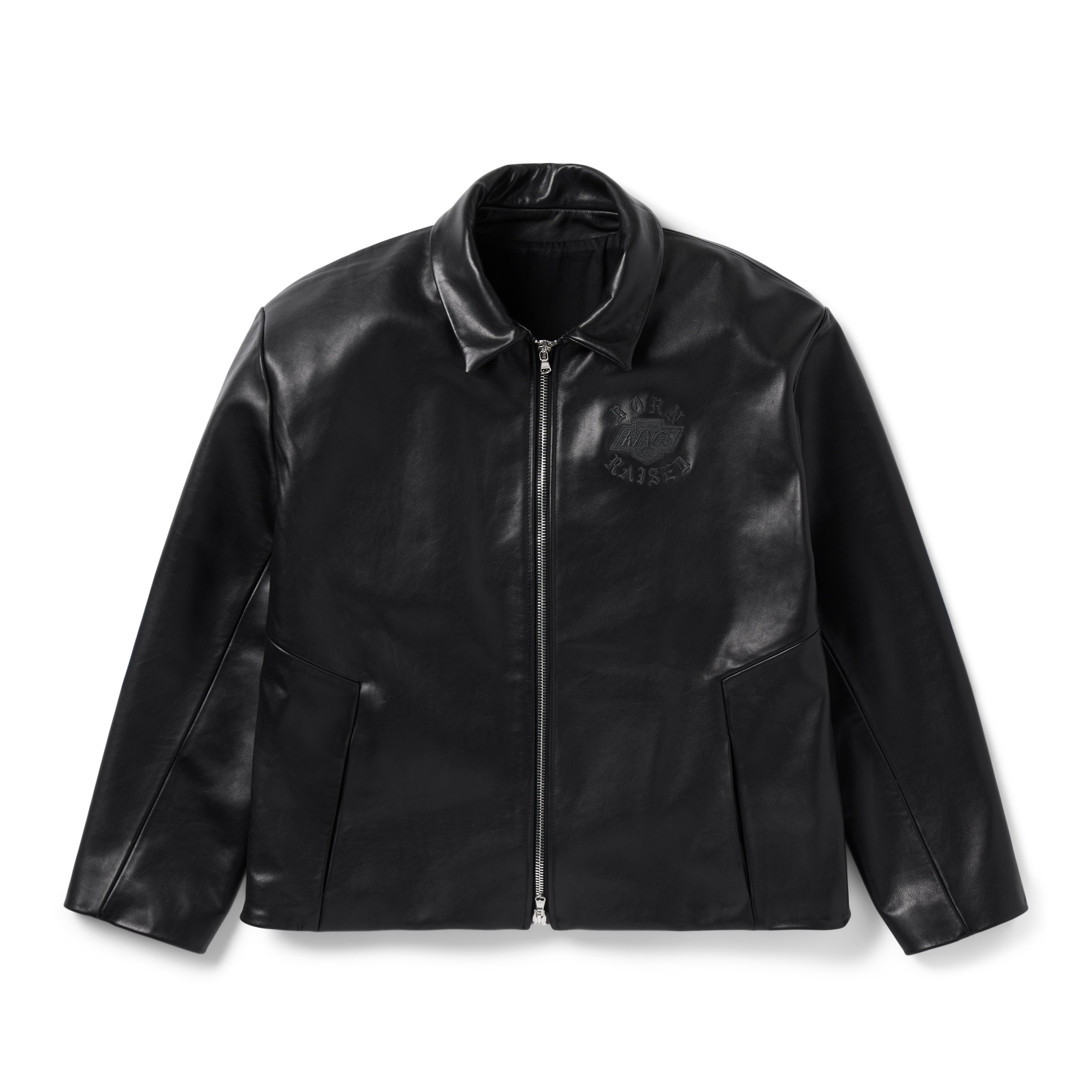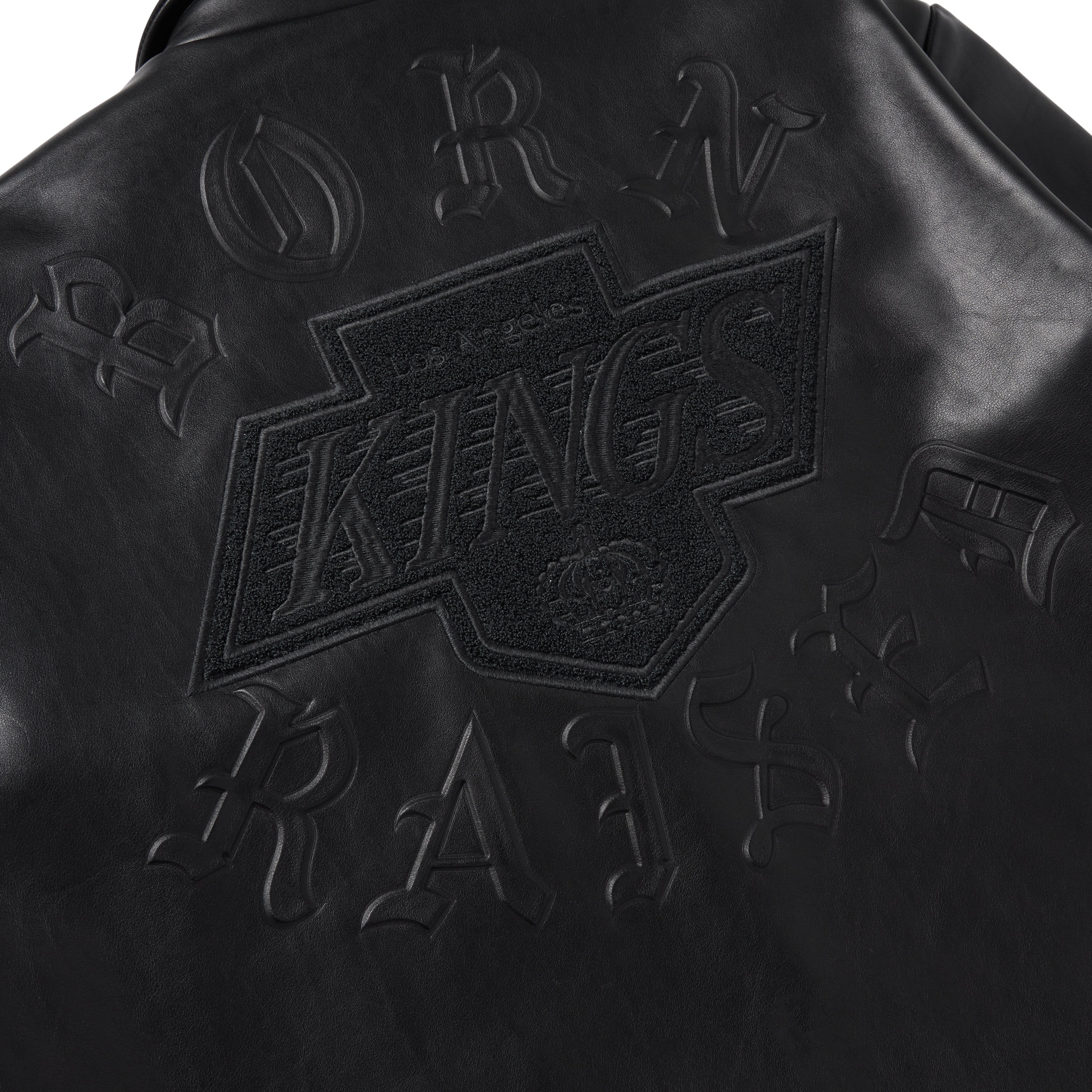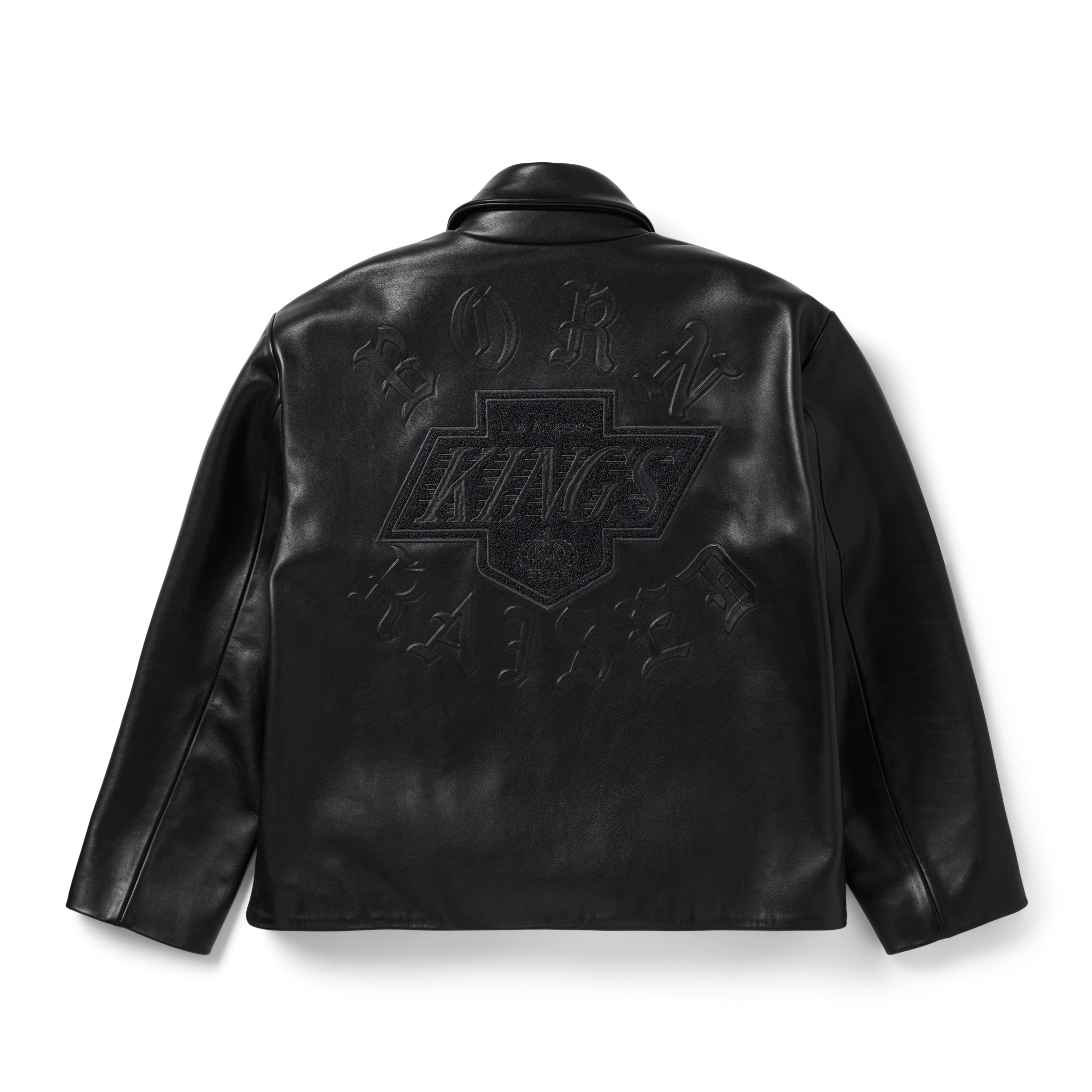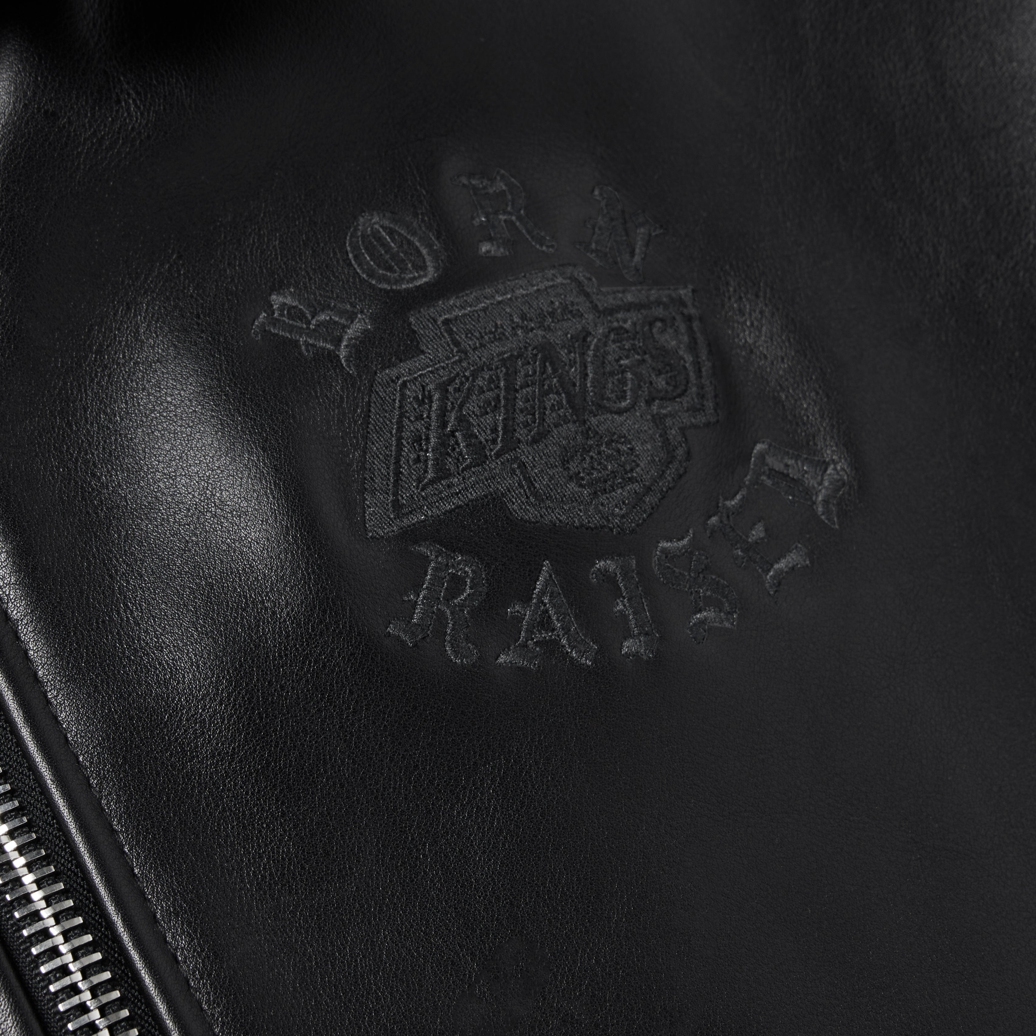 Born X Raised + LA Kings Vol. 3 Leather Jacket in Black. The jacket is hand cut and sewn in Los Angeles, then embossed with the classic Born X Raised rocker logo across the back. LA Kings patches are made in Los Angeles. Chest embroidery is applied directly to the leather.