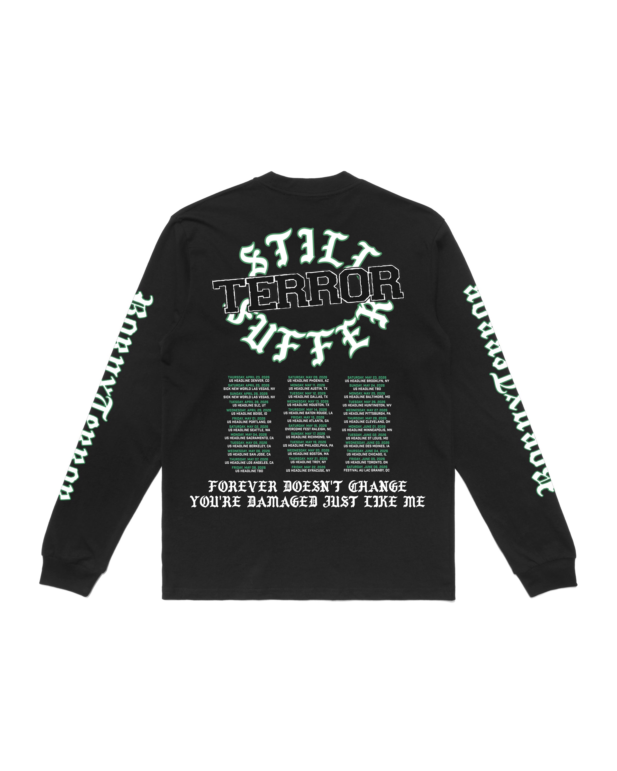 OFFICIAL COLLABORATION WITH TERROR. 100% 220 GSM COTTON RELAXED FIT LONGSLEEVE TEE. SCREENPRINTED ARTWORK ON FRONT, BACK, AND SLEEVES. *ALL SALES ARE FINAL*