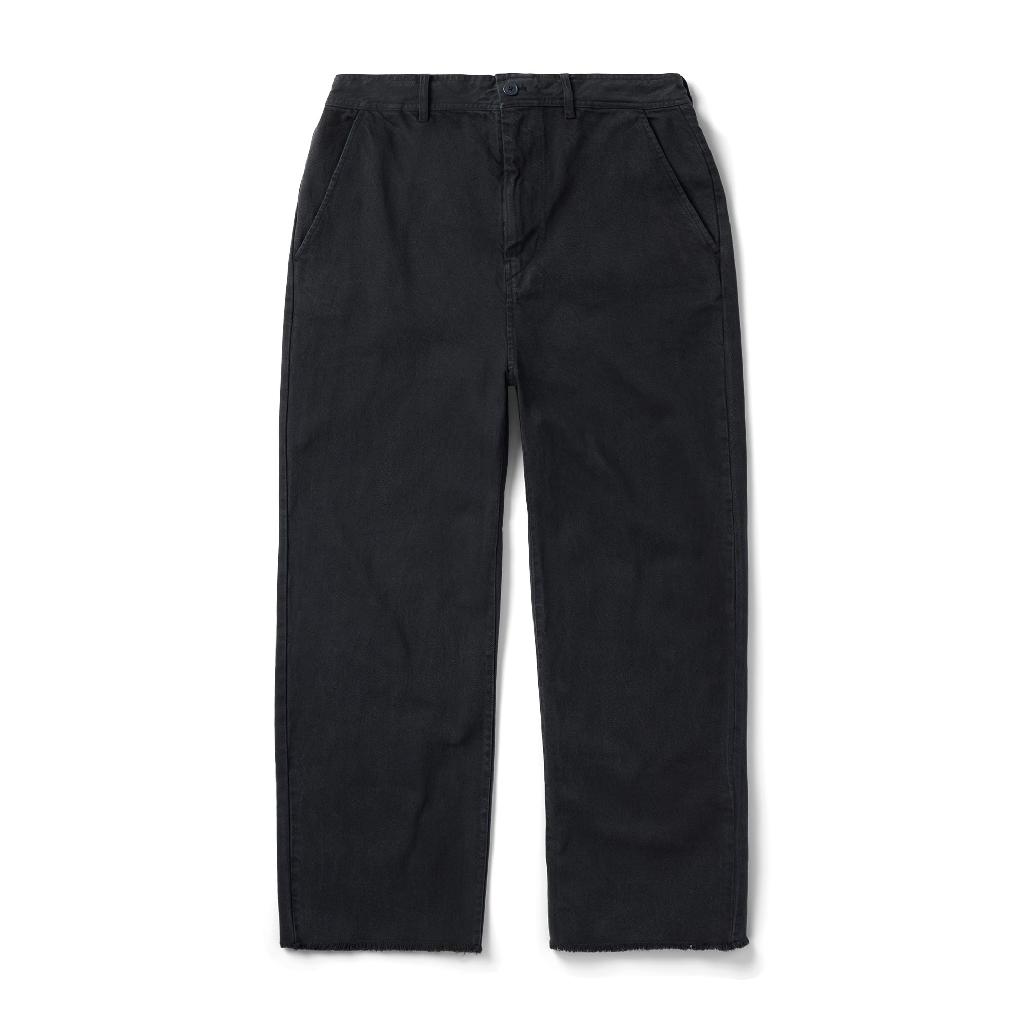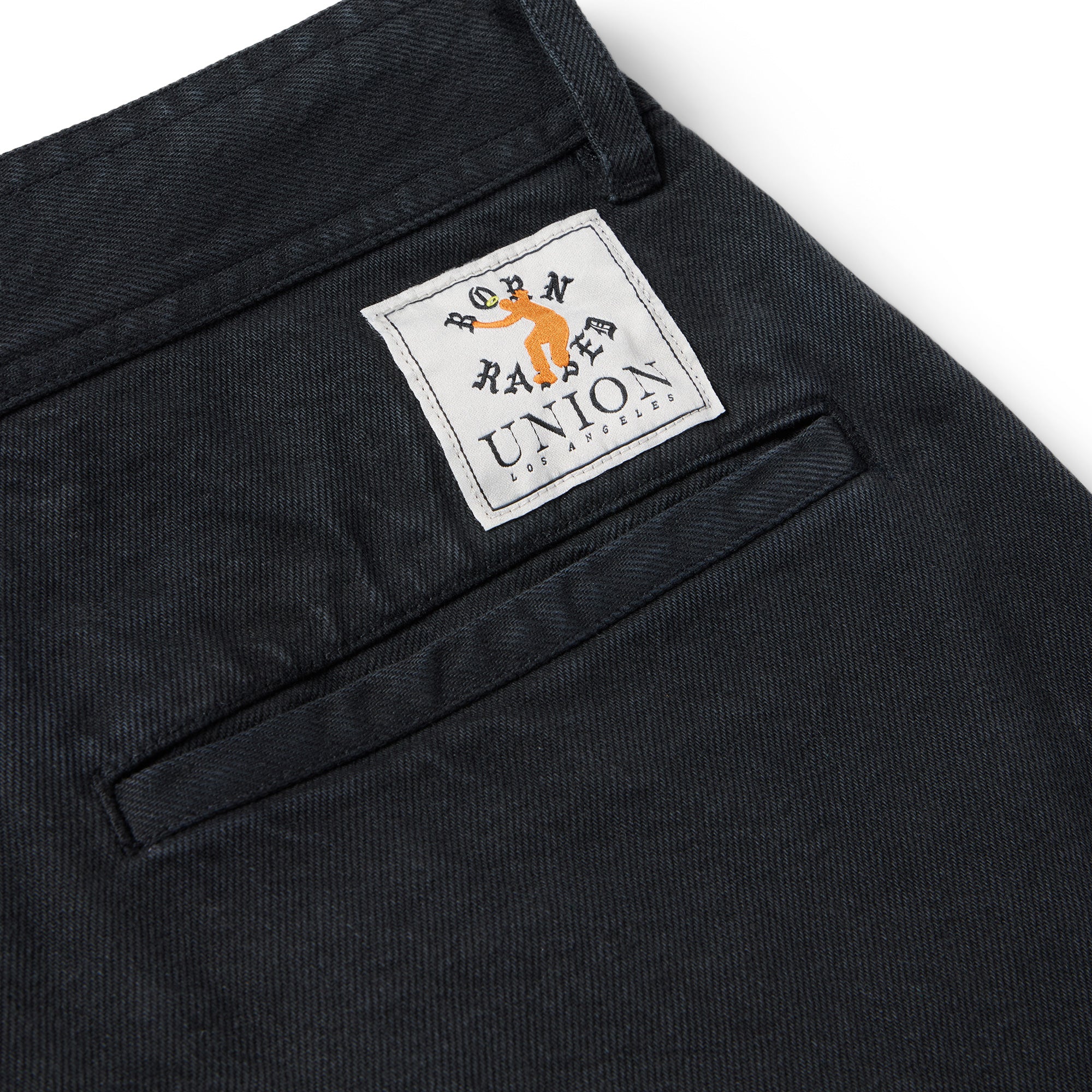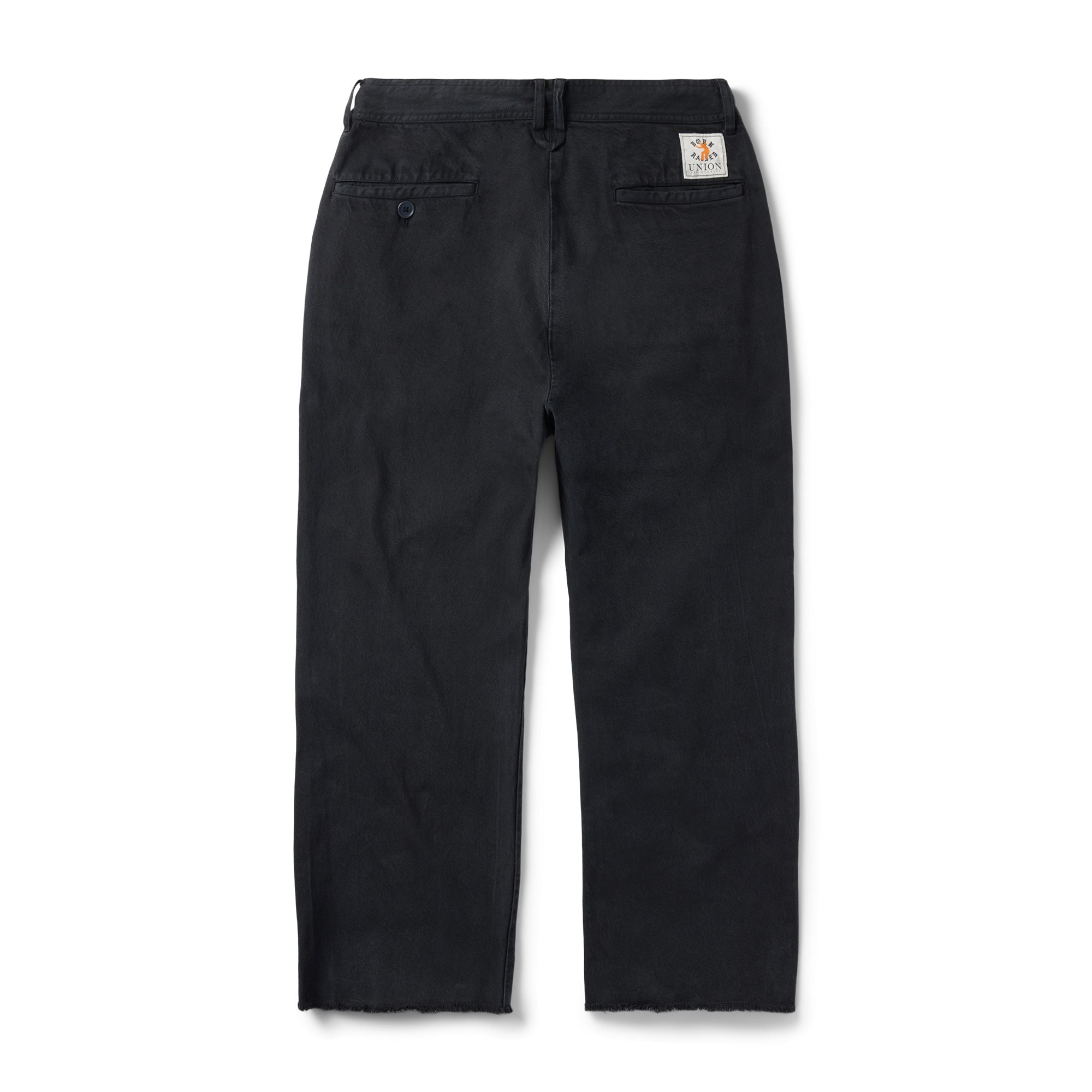 OFFICIAL COLLABORATION WITH UNION. 100% COTTON WORK PANTS WITH FRAYED CUT-OFF LEG OPENING. CO-BRANDED LABEL ABOVE BACK POCKET. CUT AND SEWN IN JAPAN.