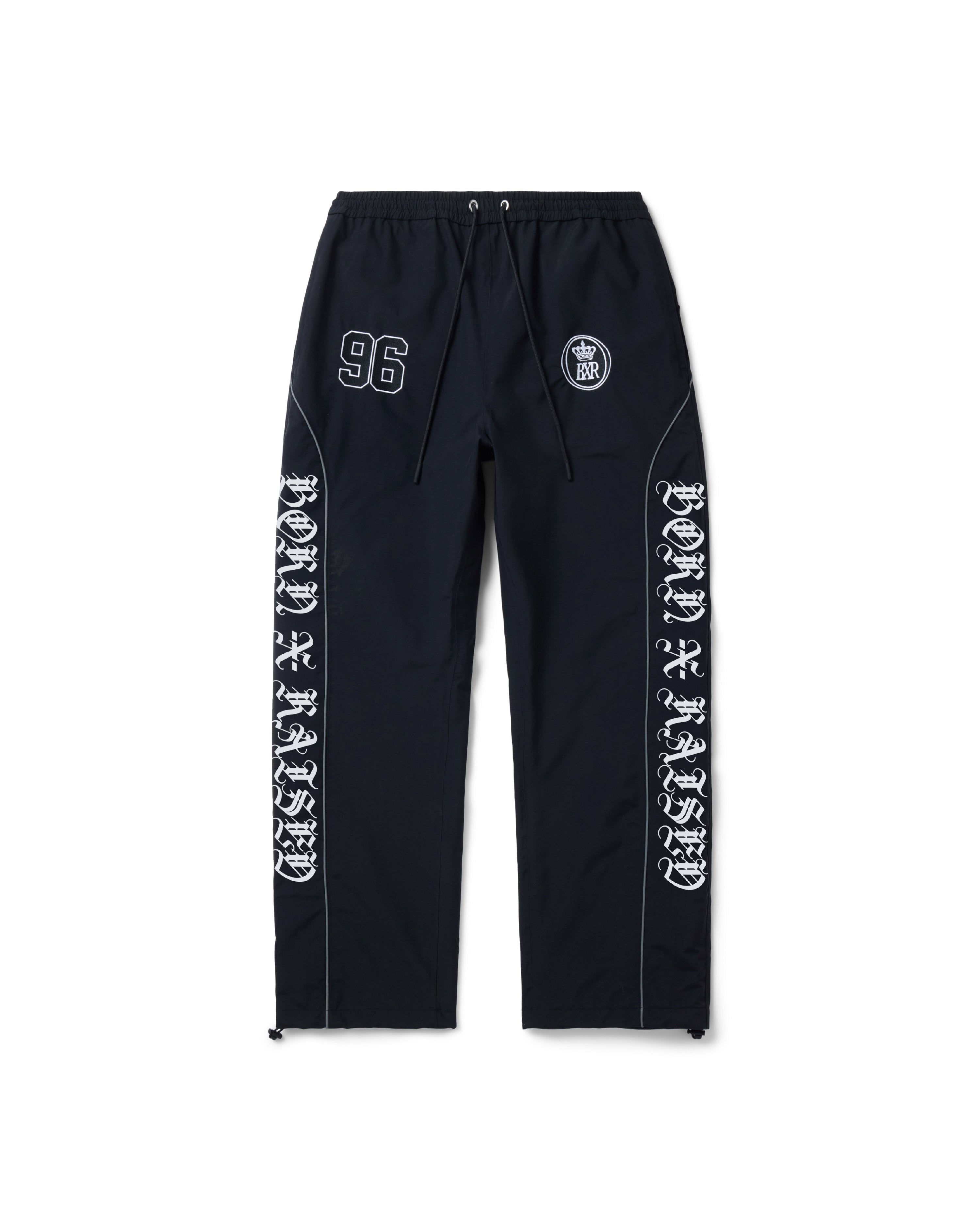 100% NYLON WATER RESISTANT SHELL PANTS. DRAWCORD ADJUSTABLE WAIST AND ANKLE. PIPING UP LEGS AND ACROSS BACK. SCREENPRINTED AND EMBROIDERED ARTWORK.
