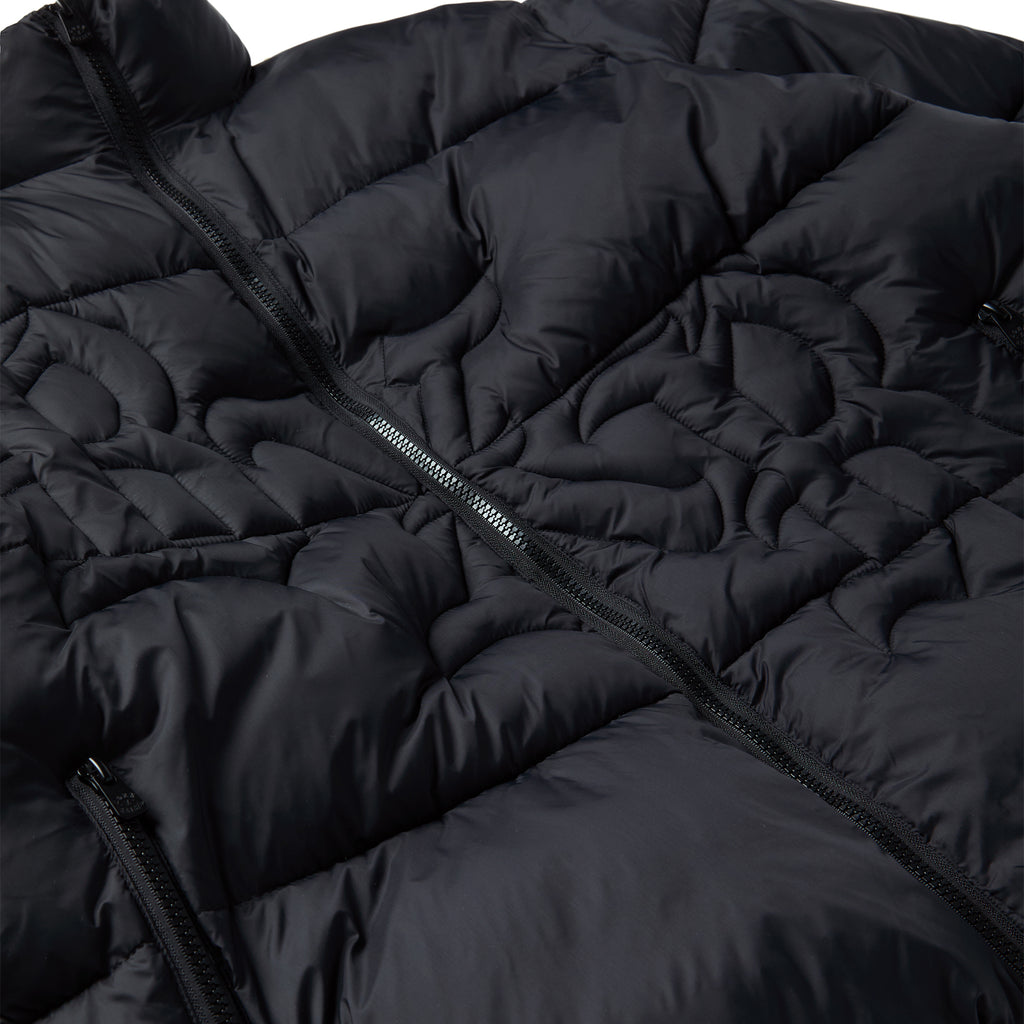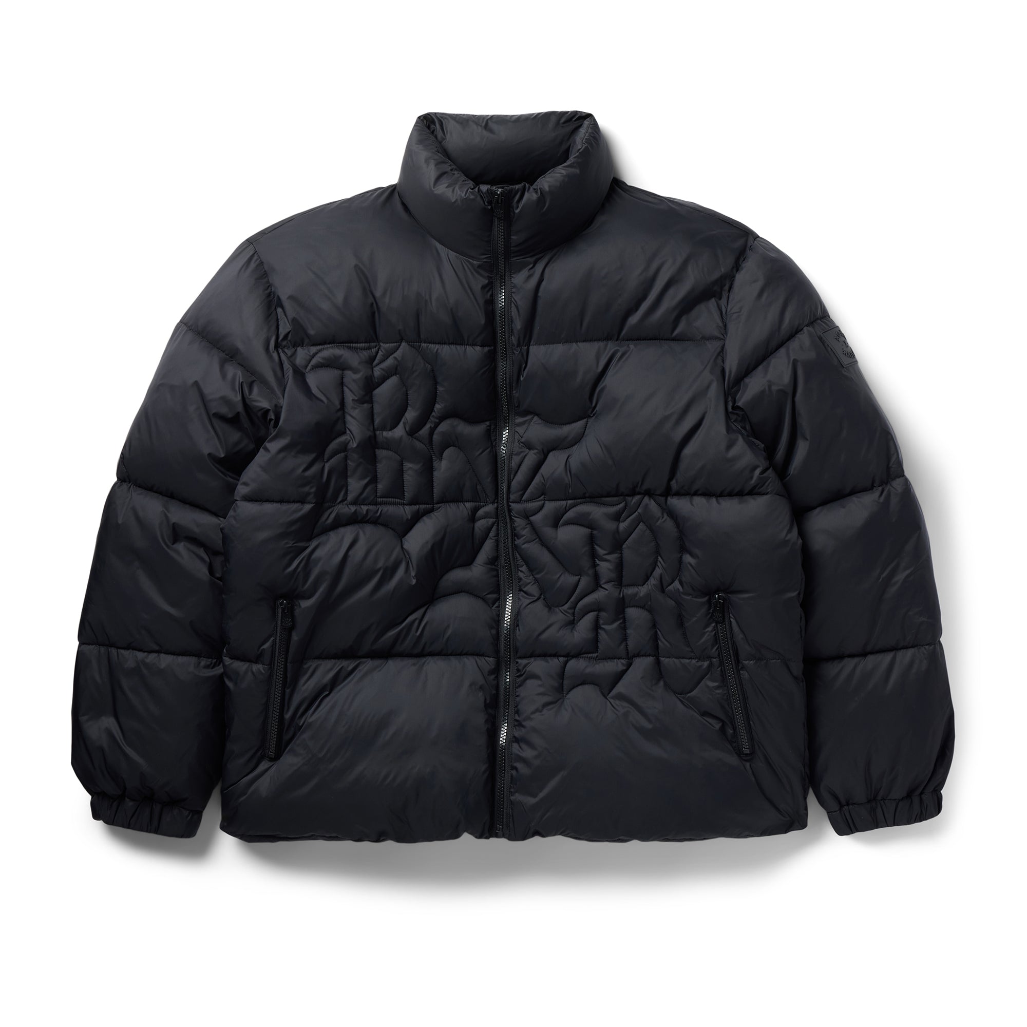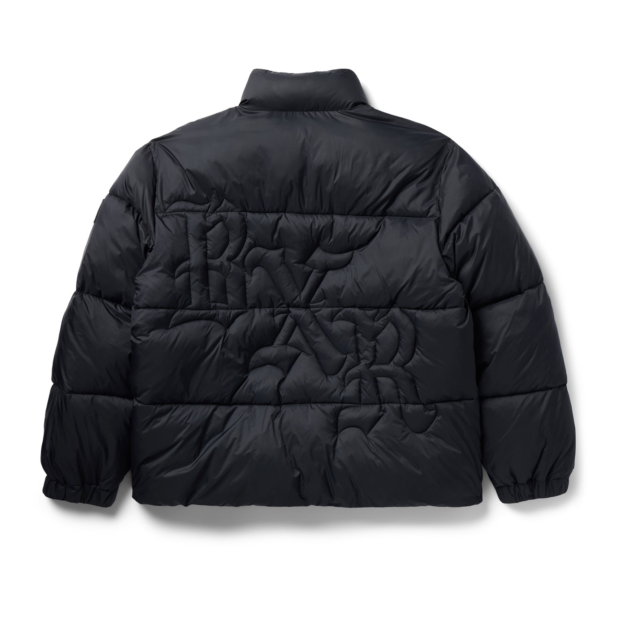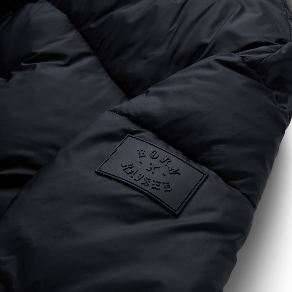 HIGH COLLAR 200 GSM NYLON SHELL PUFFER JACKET WITH 140 GSM NYLON LINING. POLYESTER FILL. INTERIOR ELASTIC CUFF ON SLEEVE. ZIP CLOSURE POCKETS ELASTIC HEM. FRONT ZIP CLOSURE. TONAL RUBBERIZED LABEL ON LEFT SHOULDER.