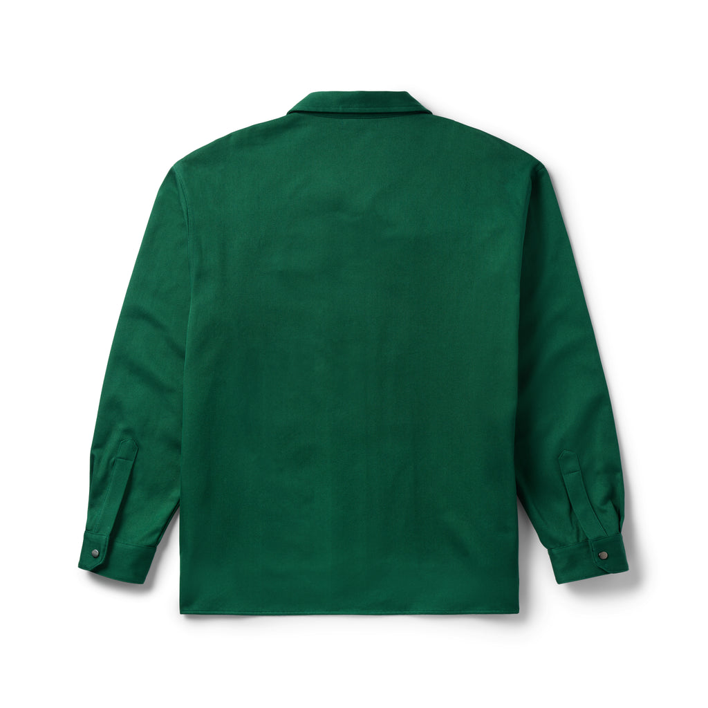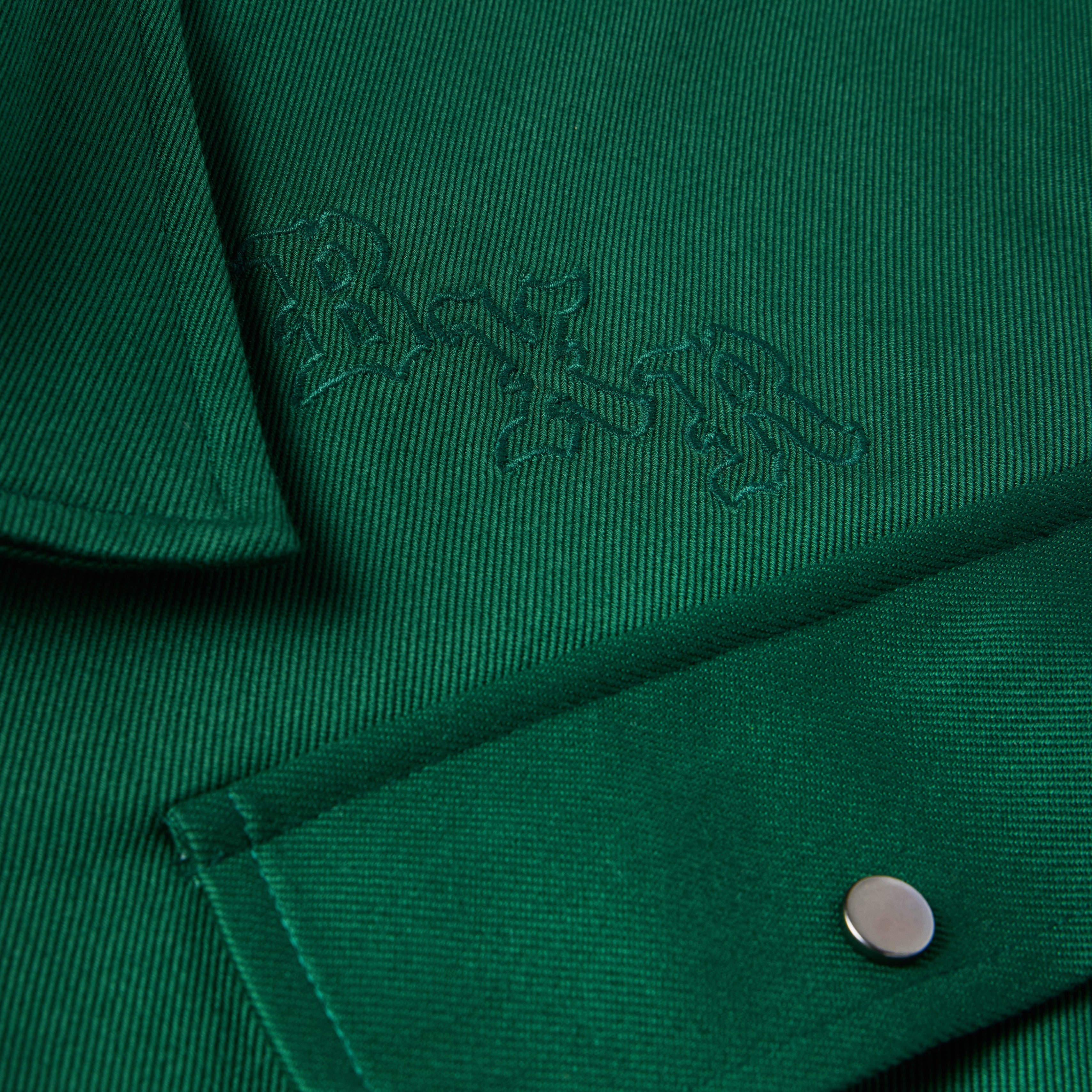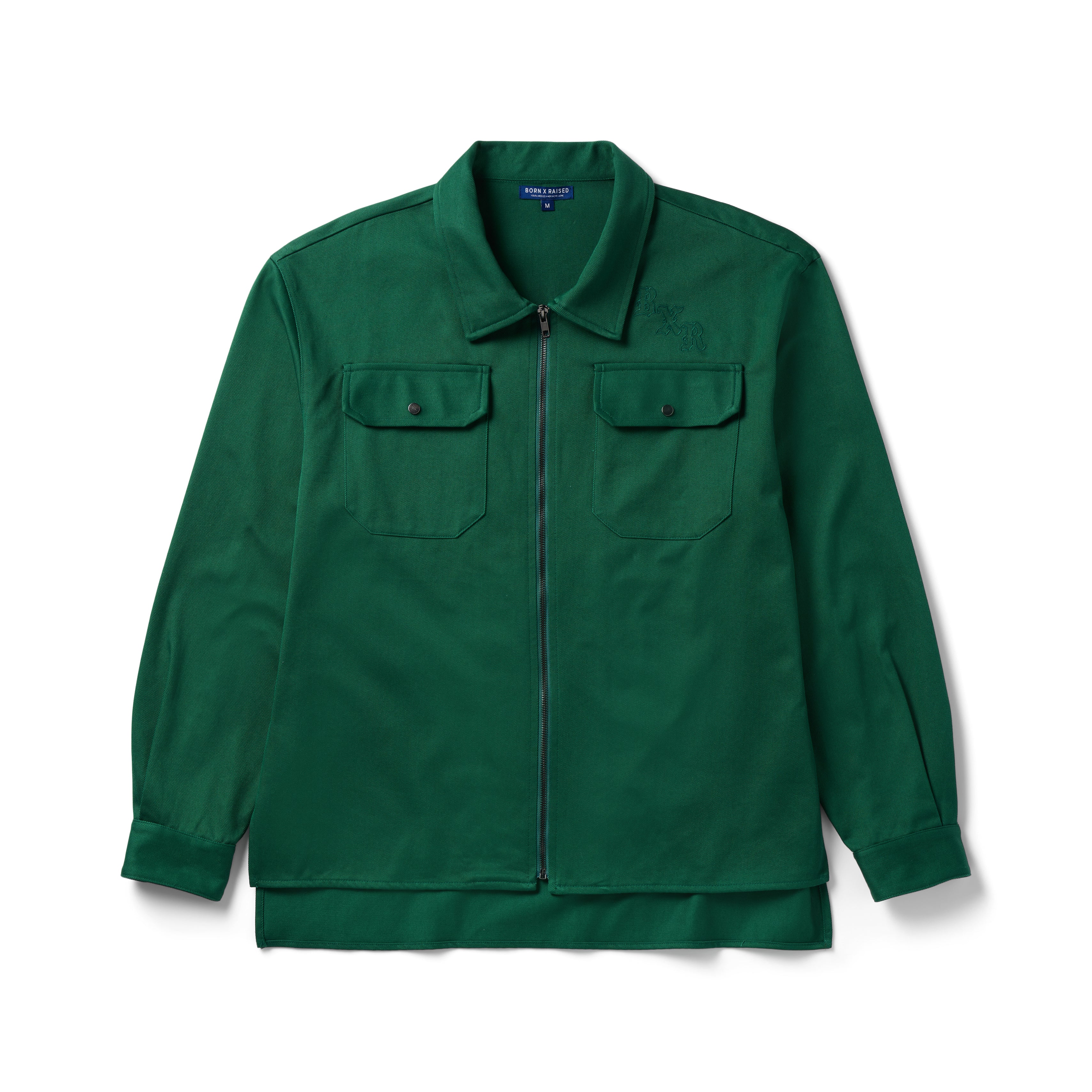 TRUE TO SIZE TWO-WAY ZIP WORKSHIRT, WITH ITALIAN SNAP BUTTONS AT FRONT CLOSURE, TWO CHEST POCKETS WITH BXR TONAL EMBROIDERY ACROSS FRONT LEFT CHEST. DROP SHOULDER FIT. FULLY CUT AND SEWN IN LOS ANGELES.