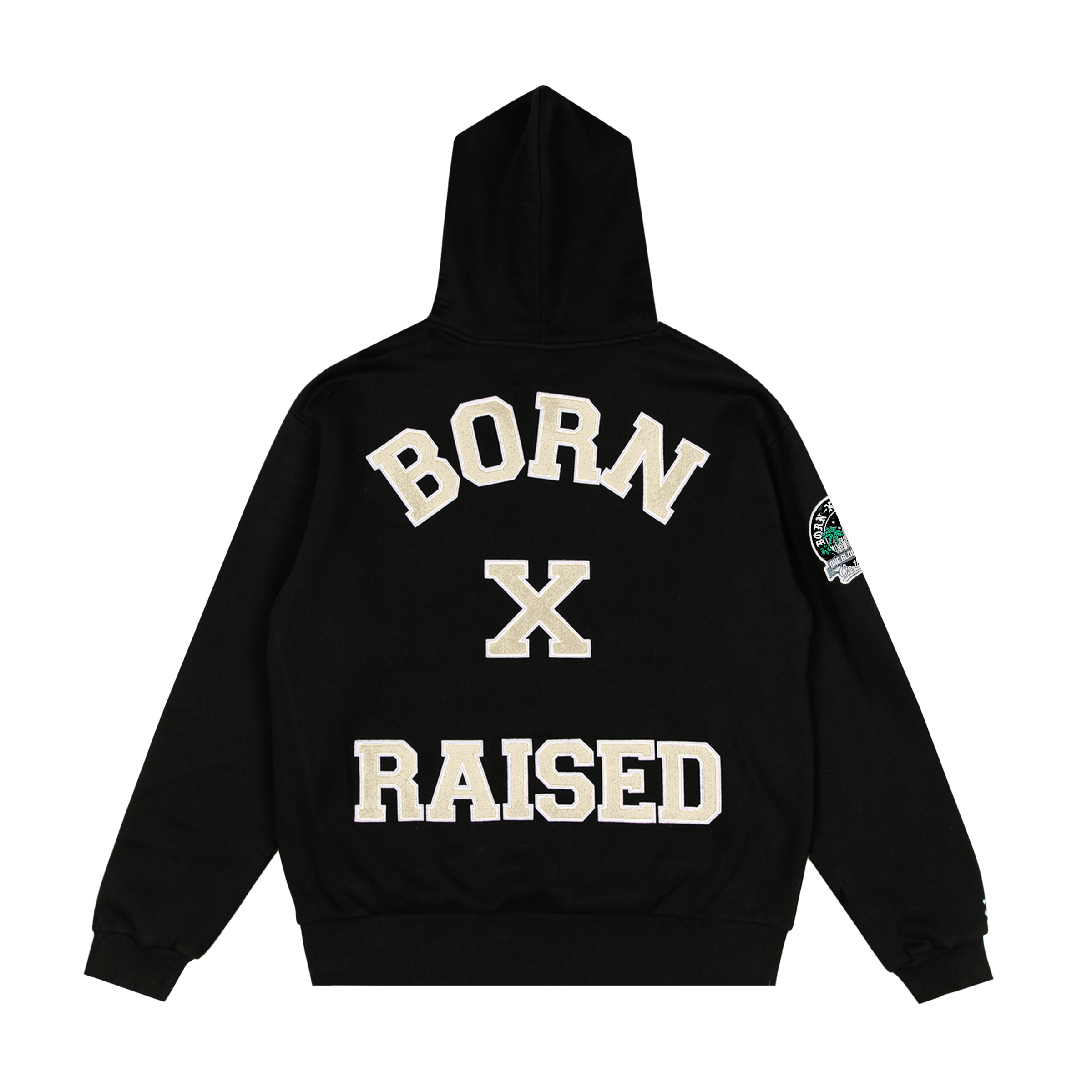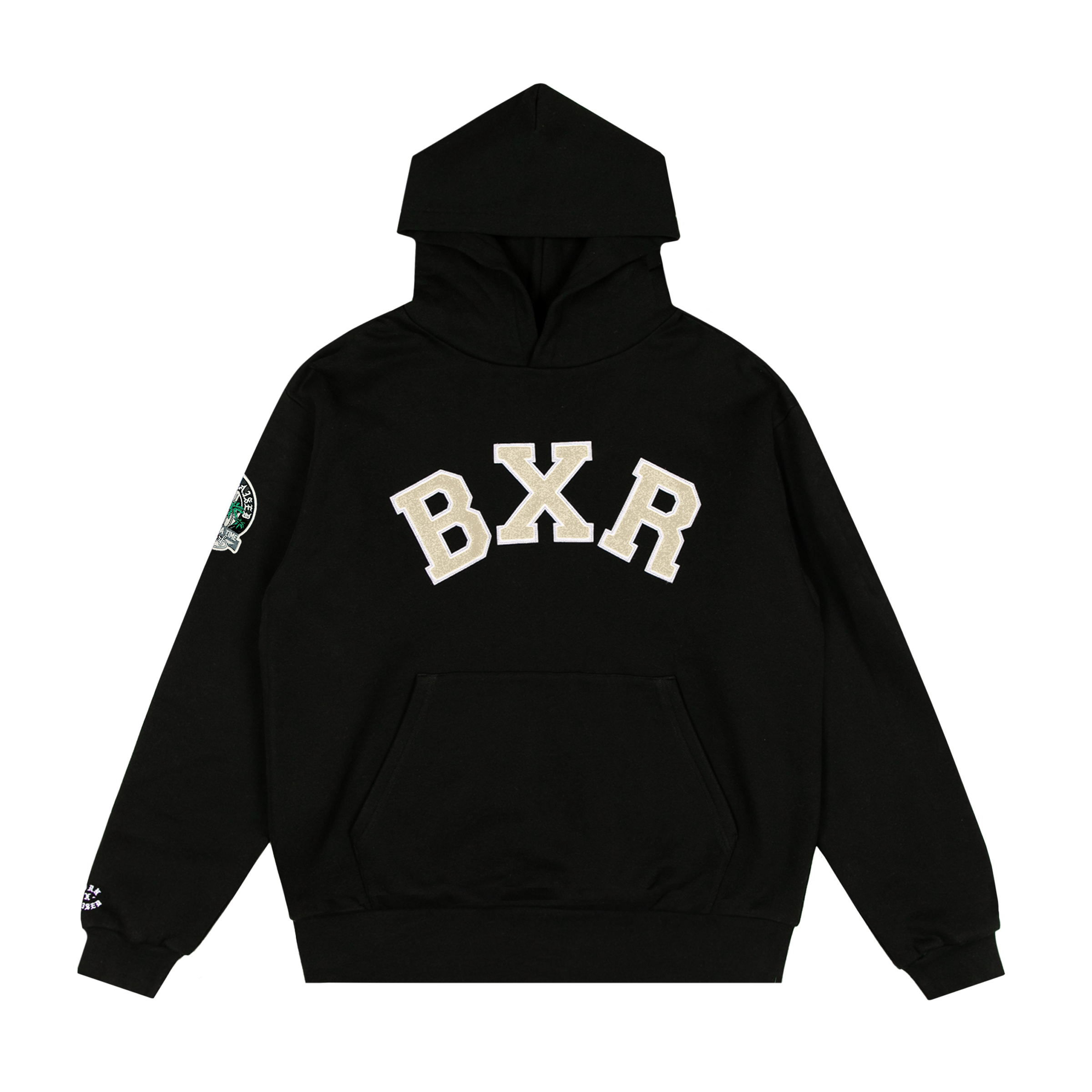 100% 460 GSM COTTON FLEECE HOODED SWEATSHIRT. CHENILLE ARTWORK ON CENTER CHEST AND BACK. EMBROIDERED PATCH AND MICRO ROCKER DETAIL ON RIGHT SLEEVE.