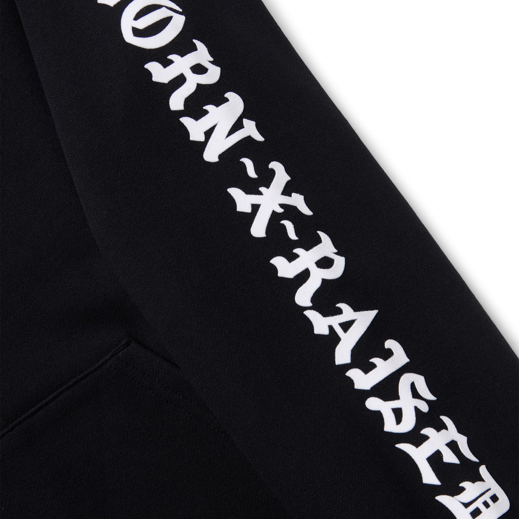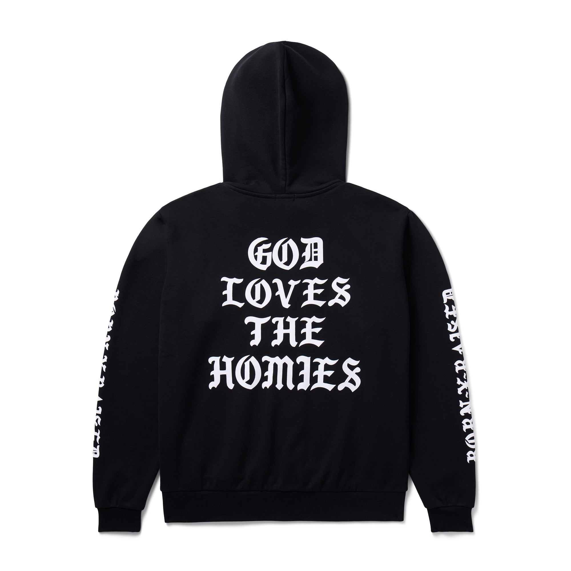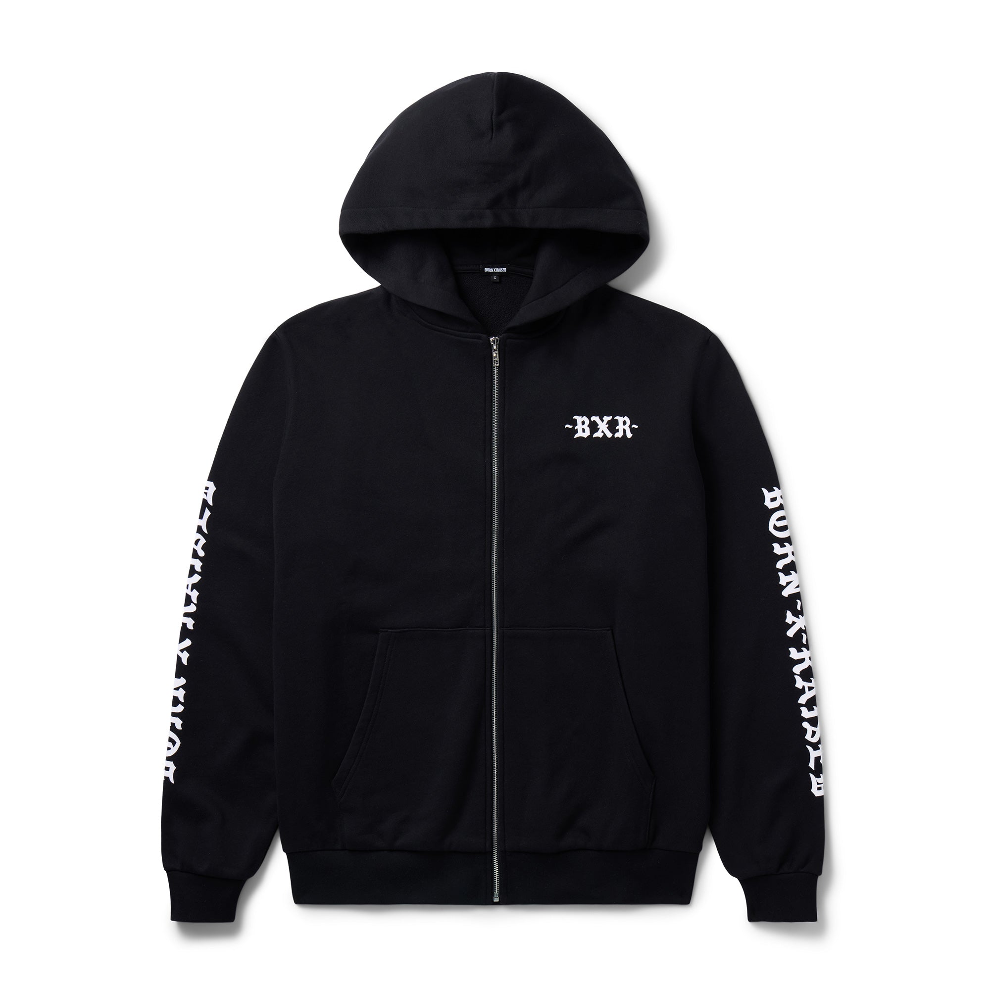 100% COTTON HOODED ZIP-UP SWEATSHIRT. FLOCKED ARTWORK ON LEFT CHEST, BACK, AND SLEEVES.
