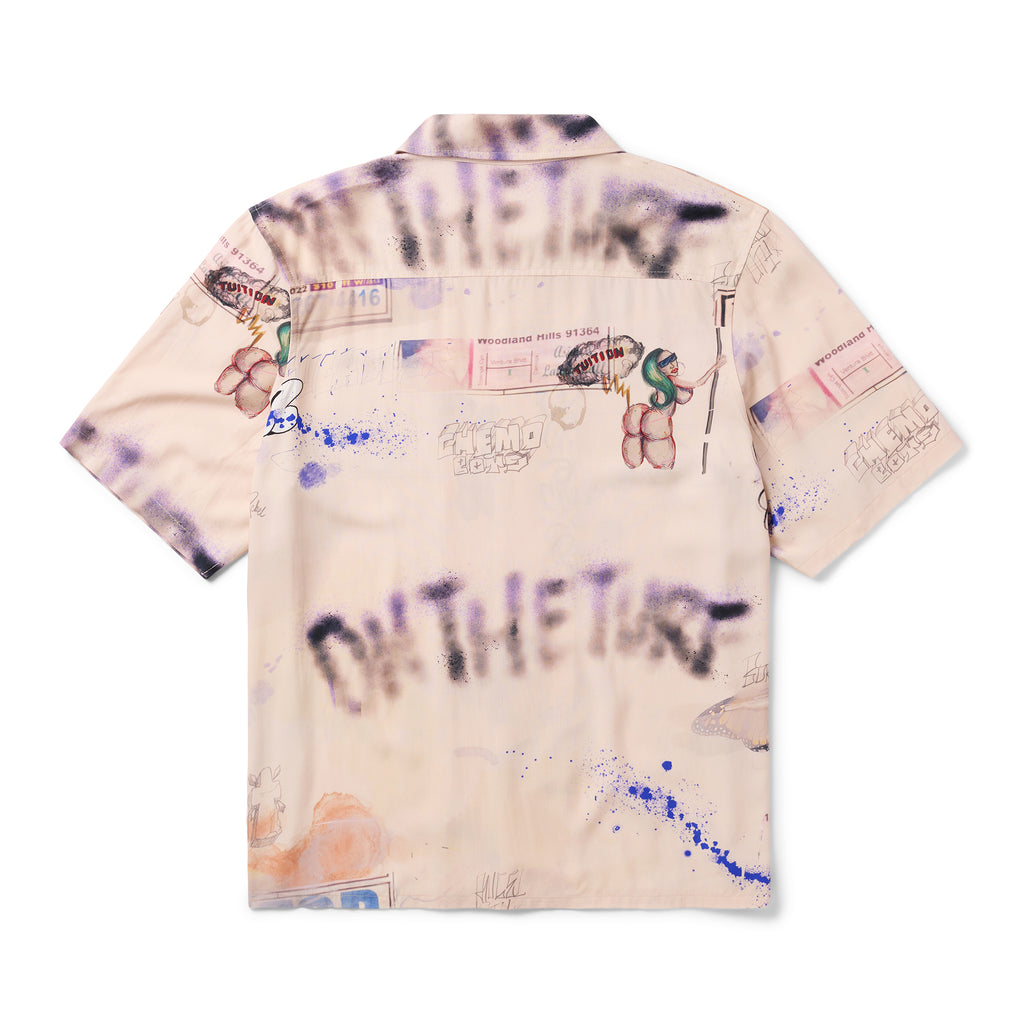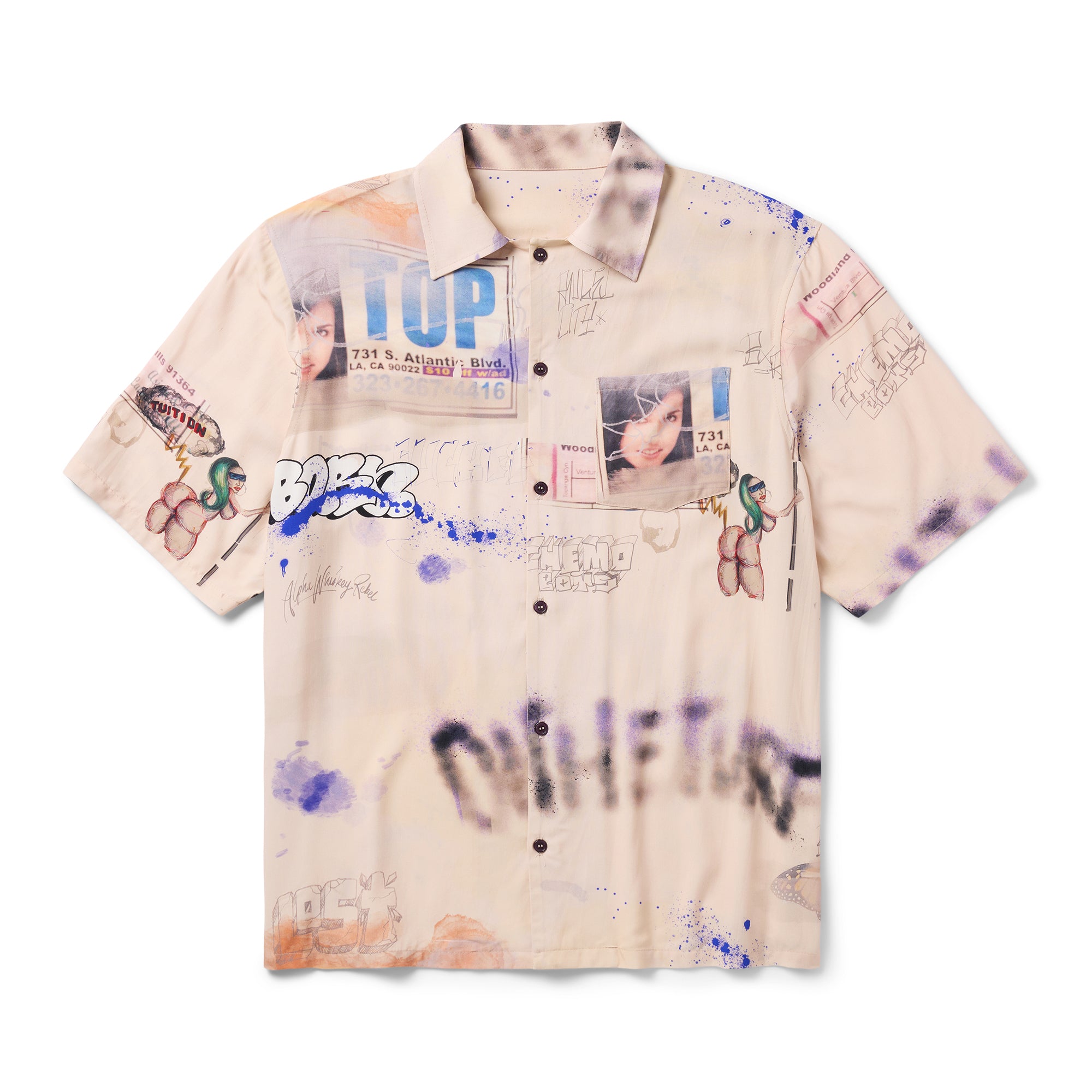 100% RAYON SHIRT SHORT SLEEVE BUTTON UP SHIRT. CUT AND SEWN IN LOS ANGELES.