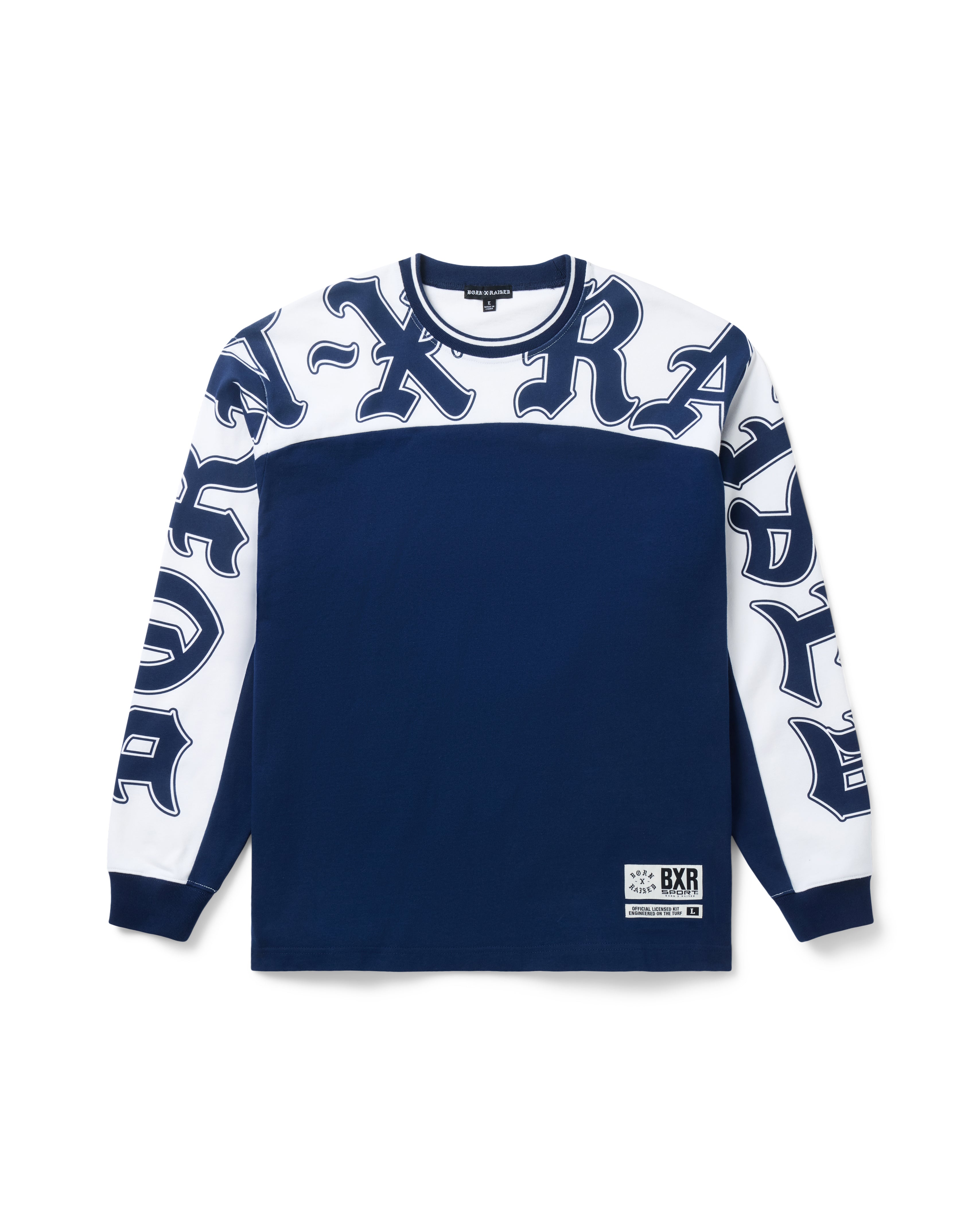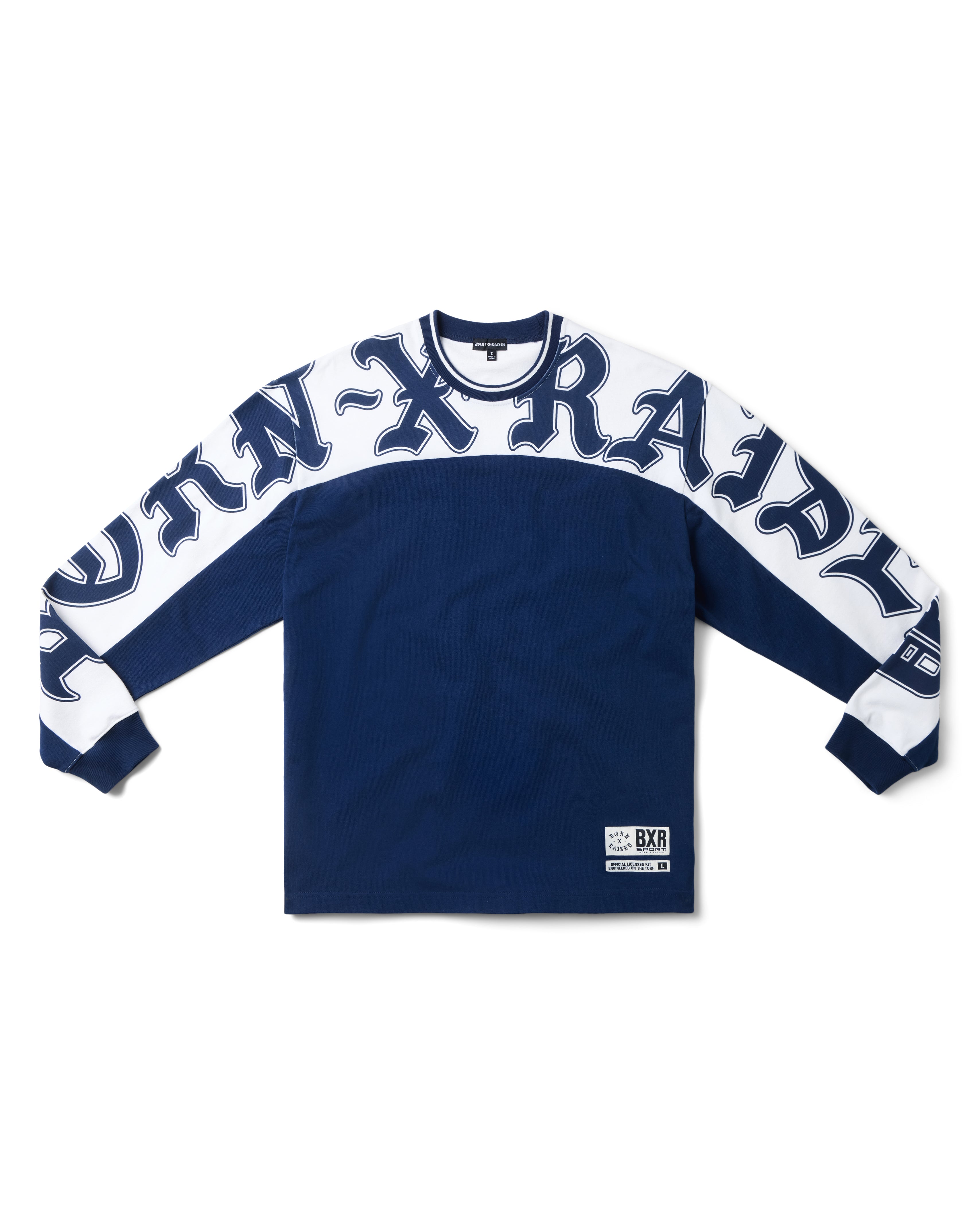 100% 375 GSM COTTON PANELED LONGSLEEVE TEE. SCREEN-PRINTED ART ON SLEEVE AND UPPER CHEST. RELAXED FIT. WOVEN BXR SPORT LABEL ON BOTTOM LEFT.