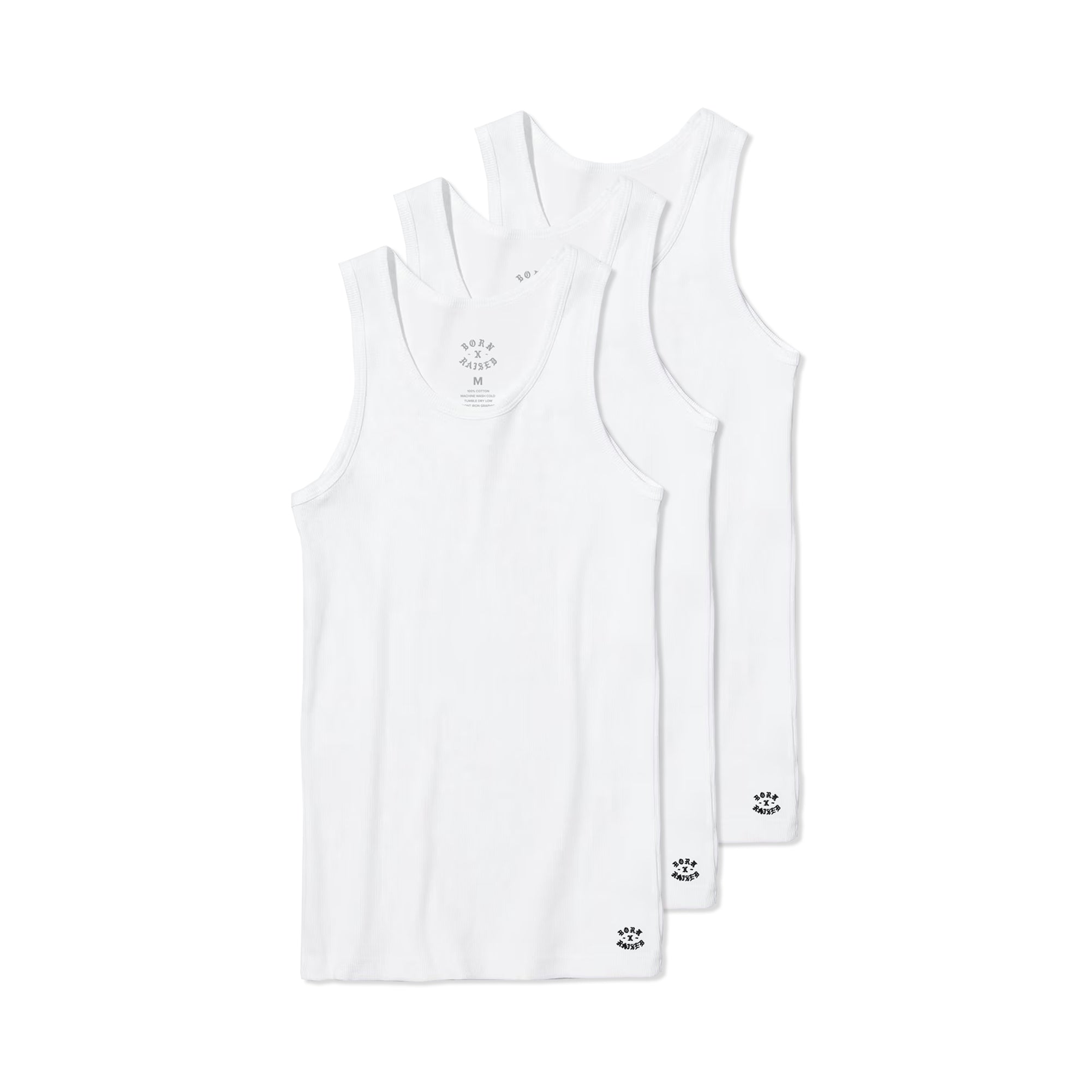 3 PACK OF 95% COTTON 5% ELASTANE RIBBED TANK TOPS. EMBROIDERED MICRO ROCKER ON LOWER LEFT.